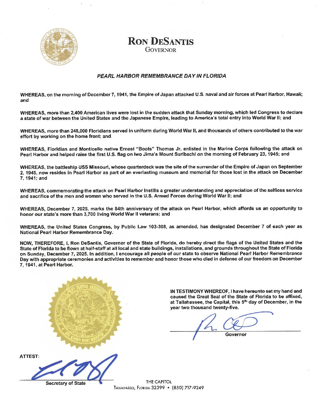 TALLAHASSEE – Gov. Ron DeSantis has signed the annual Pearl Harbor Remembrance Day Proclamation. Dec. 7, 2025 marks the 84th anniversary of the surprise attack on Pearl Harbor, which led to America’s entry into World War II.